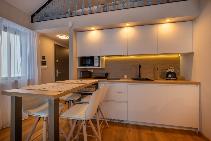 • kuchynský kút: mikrovlnná rúra, toaster, rýchlovarná kanvica, chladnička, základný riad a príbory, dvojplatnička